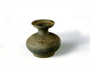 소성이 양호한 회청색의 소형 항아리로서 낮은 굽과 긴목과 넓은 입을 갖고 있다. 일부에서 자연유약이 입혀졌던 흔적이 보이나 지금은 거의 탈락되었다. 낮은 굽을 가진 편평한 밑에서 벌어져 올라가 동체부의 중간에서 팽창되었다가 다시 오므라들었는데 상 하반부가 거의 대칭을 이룬다. 목은 나팔처럼 벌어져 올라가 구연부에서 다시 크게 벌어졌다. 구연은 附加口緣 계통이며 동체의 상반부에 2중원문으로 된 도장무늬가 빈틈없이 시문되었다. 굽모양의 짧은 臺脚이 있는데 약간 외반되고 테두리를 두껍게 처리하여 안정감을 준다.